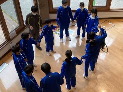 チームで手を繋いだままフラフープをリレーするもの、サークル内にランダムに置かれた数字をワンステップで順番に踏むもの、お風呂椅子を並べながら地面に触れないようゴールを目指すものと、いずれも制限時間があるので必死です。