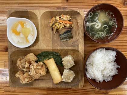 メニューは、鳥の唐揚げ・春巻き・焼売・ナムル・にしん煮付け・杏仁フルーツとご飯・味噌汁です。