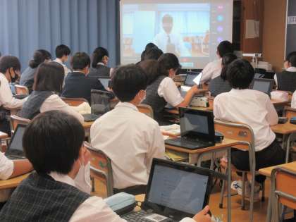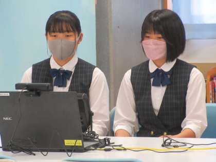 一般生徒の皆さんは、Chromebookに貼り付けられた議案書を見ながら参加し、質問も各教室と図書室との間の双方向型で行いました。こうした手法は、感染症対策で3密を回避するため2年前から採用しています。