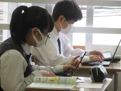 そのため屋上プールで実技を行っているのは「同意」の生徒のみです。「不同意」の場合、教室で「水泳ノート」を作成します(写真・下)。担当の先生がChromebookに貼り付けてくださっているテキストを使用し、水泳に関する基礎知識を学んだり探究的な学習に取り組んだりします。