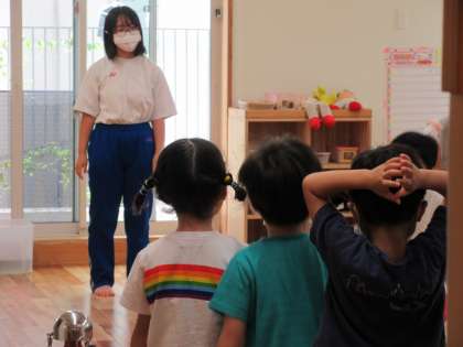 0〜5歳児の各部屋で、保育体験をさせていただいています。給食のお手伝いをしている人もいれば、水遊びのお世話をしている人もいます。写真は、室内で縄跳びの補助をしている5歳児クラスの様子です。
