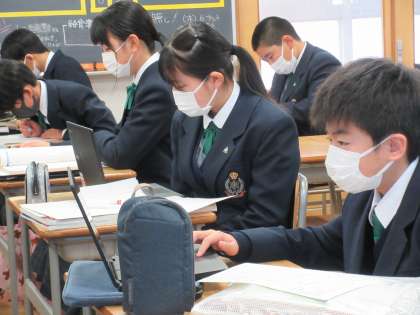 現在は推敲(文章表現の練り直し・校正)作業に入っています。推敲のポイントも、先生がChromebookにスライドで貼り付けてくださっています。それらを一つ一つチェックしながら、下書きを加筆修正しています。