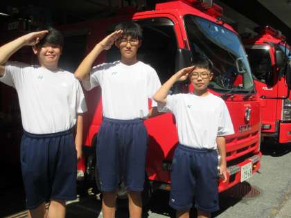 取材に伺った時は、消防車や救急車の中を見学させていただいているところでした。本校は昨年度、長年にわたる地域防災訓練により表彰されました。非常に深いつながりのある消防署での貴重な職場体験です。