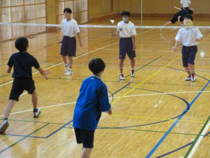 各種ラケットワークの基礎練習をした後、特に自陣後方から相手側コートに打ち返す練習に取り組んでいました。先日の区民大会で板三中生の多くが苦手としていたので、その課題を克服するのだそうです。