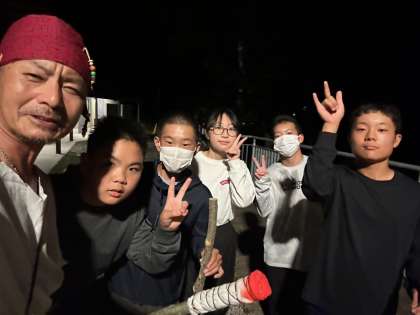 写真は、入場直前の火の神ジョニーと、神の子たちです。そのジョニーと、各クラスの火を分け与えられた神の子たちによって薪に点火され、東京で1番のキャンプファイヤーが始まりました。