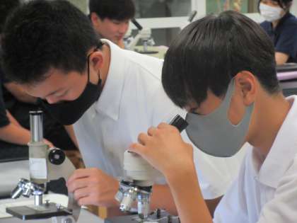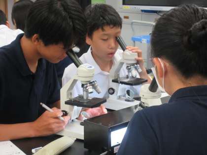 それぞれの細胞を顕微鏡で観察しながら、スケッチします。さらに、授業のめあてである両者の共通点や相違点を、言葉で表現しました。自分の細胞を観察してまとめた特徴は、きっと忘れられないことでしょう。