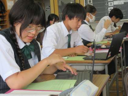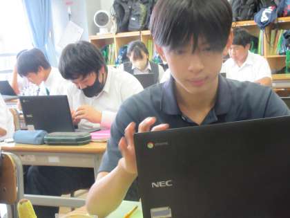 要約文は、感想文とは違います。これまでに学習した英単語や英文法の知識を活用するとともに、Chromebookで映画を検索して登場人物やストーリーを再確認しながら、作業を進めていました。