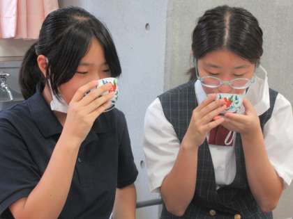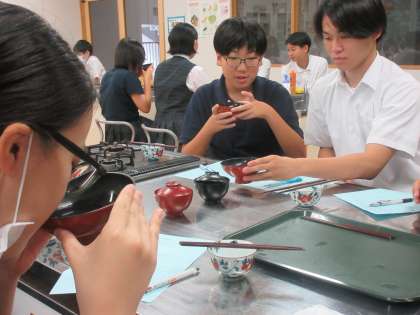 越前漆器の説明を受け手触りを確かめたあとで、「昆布だし」を試食しました。第5の味覚とも言われる「旨み(うまみ)」について、自分の言葉で説明します。○○さんに尋ねたところ「昆布をそのまま液体にしたような感じ」との感想が返り、その的を射た食レポに感心しました。