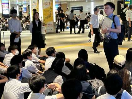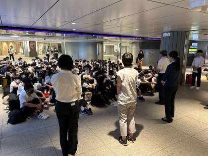 写真は、東京駅の集合場所で8時10分より行った出発式の様子です。実行委員長(生徒代表)の言葉や同行される添乗員や看護師の皆さんの紹介の後、担当の先生から諸連絡がありました。
