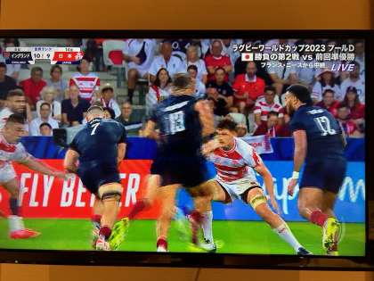 修学旅行2日目の朝を迎えました(下のラグビーW杯が見たくて起きているわけではありません)。写真は、先ほど4時過ぎの宿舎です。宿舎の廊下には、一様に生徒たちの寝息が聞こえていました。