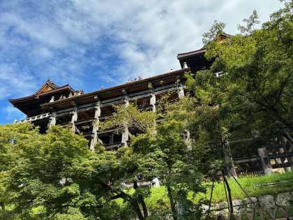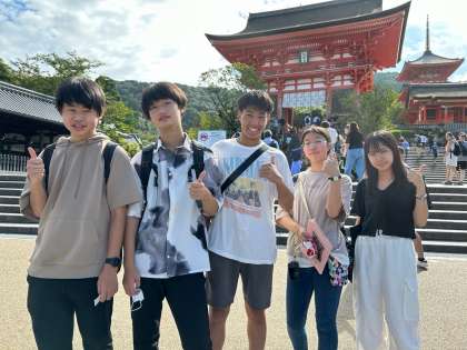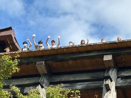 チェック時間前ですが、清水寺を巡回していると、舞台の上から手を振る最初の板三中の人たちがいました。1組5班の皆さんです。