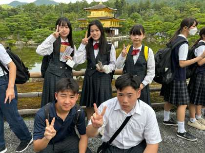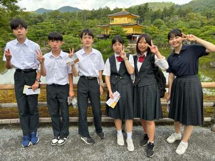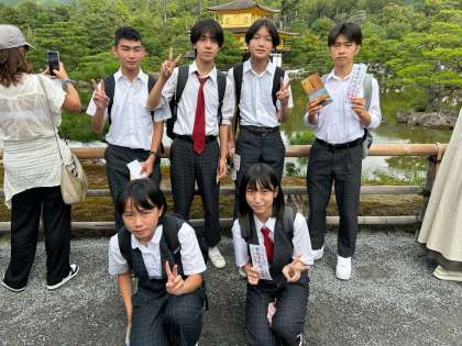 金閣寺に到着しました。昨日の清水寺と同じで毎年のように訪れる場所ですが、最初に見た時はやはり毎年のように「おっ!」と目を奪われます。初めて見る生徒の皆さんは、なおさらでしょうね。