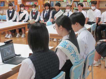 生徒の皆さんの負担軽減や効率化を図るため、立会演説会はオンラインで実施しました。教室の様子を見て回ったところ、全ての生徒が真面目に立候補理由や公約に耳を傾け、公報紙にメモを取る人もいました。