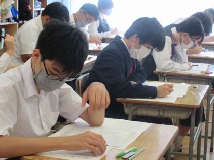 この「まとめテスト」は、1〜5時間目にかけて国語・数学・英語・社会・理科の5教科のテストを行います。結果は学校の評価には反映させず、進路選択の資料として活用します。全3回中、今回は2回目です。