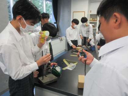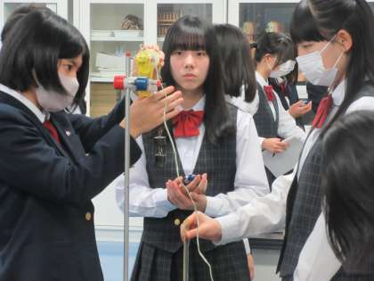 『エネルギーの変換と保存』の学習で、発展的な実験に取り組んでいました。水力発電は、ダムの水の位置エネルギーが、水路を落ちて運動エネルギーとなり、さらに発電機を回して電気エネルギーに変換されます。