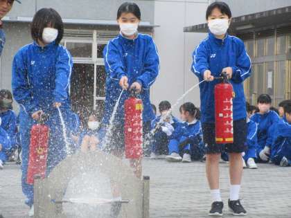 (写真・中)は、C級・D級ポンプを使用した校庭での放水訓練です。やや小型のD級と、一回り大きいC級を使い分けています。中庭では、消火器を使った初期消火訓練も実施しました(同・下)。