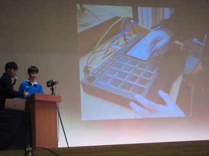まず特別授業では、今年で誕生50年となったヒップホップの説明を受けました。そして、電子ドラムとも言えるMPCの演奏を聴いたり体験させていただいたりしました(写真・上)。