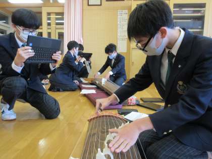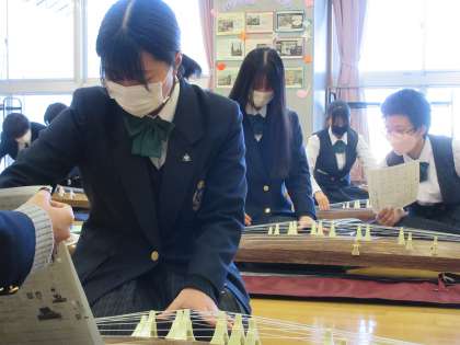 本校は、箏(こと)の和楽器実習です。演奏しているのは『さくらさくら』で、3時間の授業で取り組みます。これまでに「譜面どおりに演奏」「押し手の技法を使って1オクターブ上の音程で演奏」「変奏曲を演奏」と、3段階でレベルアップする演奏を練習してきました。