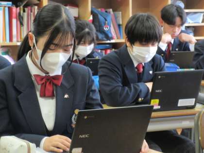 授業のめあては【文化としてのスポーツの知識を身につける】とあります。自分の好きなスポーツを選び、そのスポーツが「健康な心と体づくり」「国際親善・世界平和」「人々の交流」等に果たしている役割を調べていました。スポーツをしたり見たりする新たな視点ができましたね。