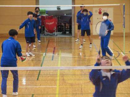 中学校での保健体育最後の授業です。あいにくの天気だったので、体育館で行っていました。最後は何の種目かと見てみると、例えばバドミントンのコートの奥では、バレーボールを行っています(写真・上)。