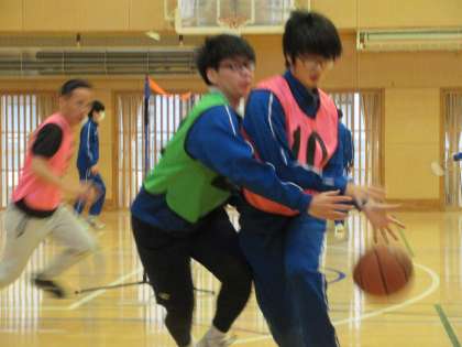 そうかと思えば、コート4分の1を使って2対2のバスケットボールに取り組む人たちもいます(同・下)。先生のお話では「最後の授業なので、選択制の授業にしてみました」とのことでした。自分たちで取り組みたい種目・取り組める種目を考え、自分たちで準備・進行しています。