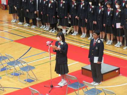 前の記事で「卒業生147名一人ひとりが主役」と申しましたが、「答辞」との変更点は言葉を学年全員で紡ぐという内容面だけではありません。学年全員が前に出て、保護者席に向き合う形を取りました。