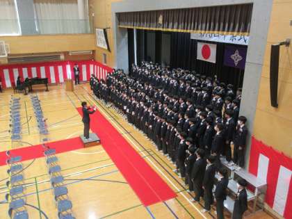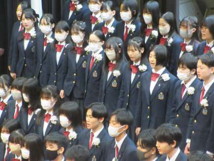 そして、『立志の言葉』を述べる間に『遙か』『旅立ちの日に』の式歌2曲を挟みました。こちらも隊形移動や歌唱練習が不十分な中にあって、見事に板三中卒業式の新たな歴史の一歩を刻んでくれました。