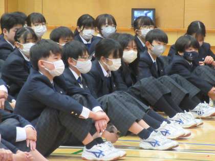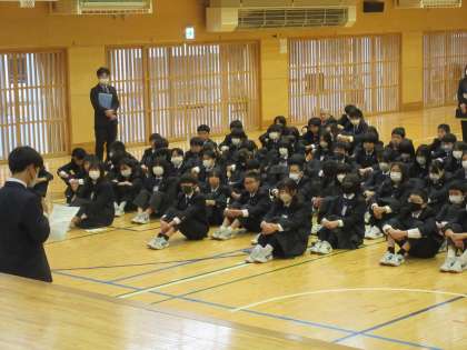写真は、いずれも7年生の合同学活(学年集会)の様子です。各クラスの学級委員より今年度の反省や、次年度に向けての改善点が発表されました。また、年度末をもって異動される先生からのお話もありました。