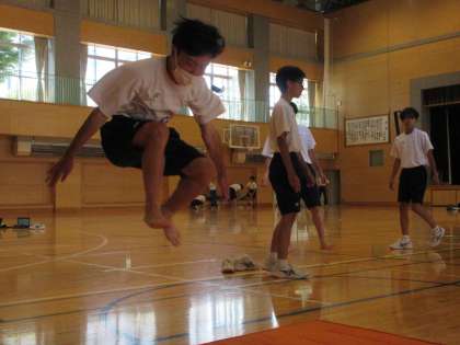 計測前にはChromebookを使い、Classroomに貼り付けられたストレッチ方法や各テスト項目の動画をチェックし、入念に準備してから反復横跳び(写真・上)や、立ち幅跳び(同・下)の計測に臨みました。先の授業のめあては、長いだけでなく実効性を伴っていることが伝わりました。
