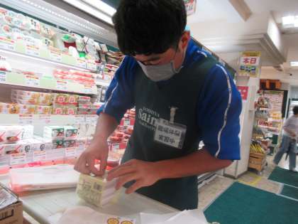 スーパーの仕事というと真っ先に思い浮かべるのはレジ打ちや商品の陳列ですが、このようにバックヤードの整理や、各種商品の袋詰めなど目に触れない場所での仕事も大事です。これもまた、良い体験ですね。