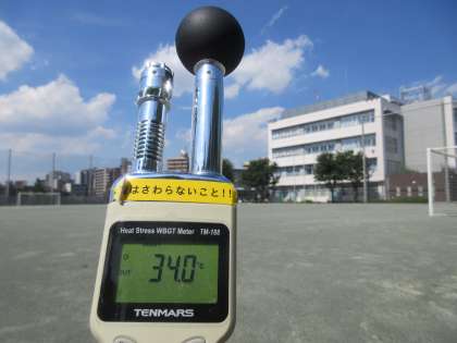 WBGTは、気温・湿度・輻射熱(ふくしゃねつ)・気流の4要素を取り入れた指標です。写真のように、数値が31.0以上になった時点でその場所での運動は中止とします(写真は7月末の猛暑日の計測値です)。