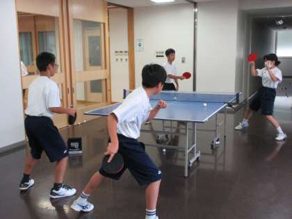 写真の練習風景を見て、てっきりダブルスの練習かと思いました。しかし、実はスペースの関係で2組の練習を1台の卓球台で行っているだけなのだそうです。両ペアとも器用にラリーをしていて感心しました。