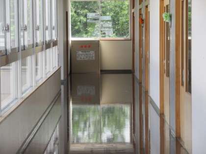 写真は、完全休校日前に用務員さんたちがワックスをかけてくださった廊下です。窓の景色を映す様子は、まるで水を張ったようですね。猛暑の中でそのようにきれいにしてくださった方々に感謝しつつ、学校再開後は上履きの跡(白い筋)をつけたりしないよう気をつけましょう。