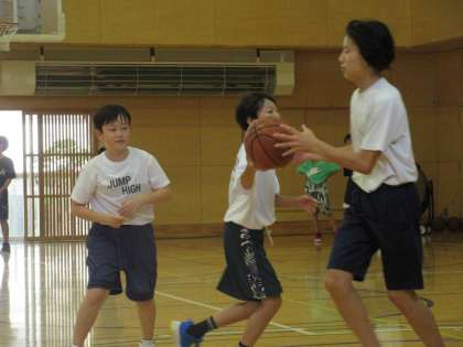 3人1組になり、各自がポジションを入れ替えながらボールを回してゴール下まで運ぶ練習です。3人の真ん中に来た人が走る味方にボールを手渡しする感じですが、まるでトリックプレーのようでした。