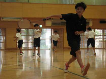 10種近いのステップでダッシュを繰り返し体をほぐしてから、シャトルを使わないショットの練習です。コートの前後左右に移動しながらさまざまな打ち方(素振り)を繰り返すので、ハードな練習に見えました。
