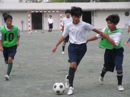 ゲーム練習に取り組んでいます。ゲームといっても、参加者数の関係で1チームのフィールドプレーヤーは4人です。直前に行った2対2の練習の成果を示すうえでは、最適な人数だったかもしれません。