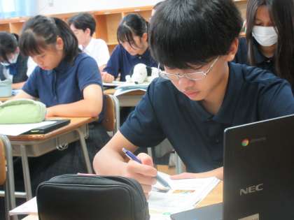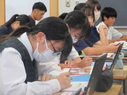 まず、英語の天気予報を聞いて、週末のWeather(天気)Temperature(気温)等を表に記入します。日常の授業でも冒頭で行っている sunny=晴れ・cloudy=曇り・rainy=雨などの天気確認が役立ちましたね。その後は、おすすめの場所の情報等を聴き取り、週末の予定を立てました。