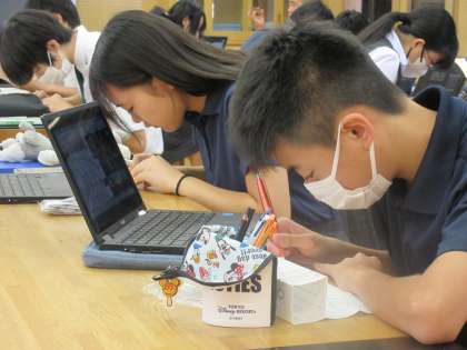 皆さん、Chromebookで検索をかけながら、シンプル且つ個性的なデザインを施していました。話を聞くと、今月は修学旅行や定期考査等の関係で、実習できる授業はこの1時間だけなのだそうです。その自覚があるせいか、皆さん集中して作業に取り組んでいました。