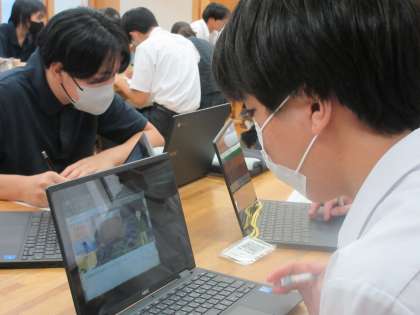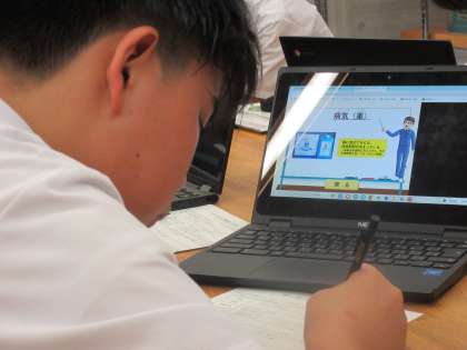 本校独自のこの取り組みは、個別最適な家庭学習の支援をすると同時に、感染症拡大や自然災害等の有事の際にも「全ての生徒の学びを止めない」訓練も兼ねるというDSTP(誰1人生徒を取り残さないプロジェクト)の視点に基づいた取り組みです(写真は、通常の授業風景です)。