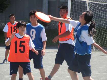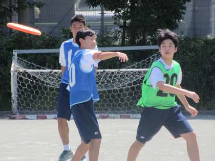 授業では、まず基本的なパス(投げ方)の練習をしてから、3チーム対抗のゲームを行いました。素早く短いパスをつないだり、ロングパスで一気にエンドゾーンを狙ったりと、戦術にもチームカラーが出ていました。
