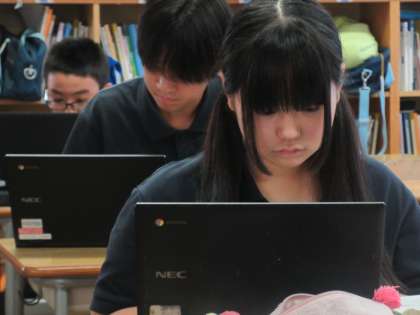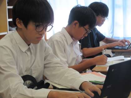 この時間もそんな復習に取り組んでいましたが、やり方は「試験の予想問題作成」でした。教科書やノート、ワークシート等を見直しながら「テストに出そうだな」と思う問題をつくり、Chromebookに打ち込みます。