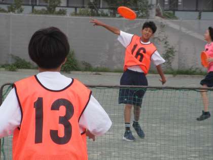 すると、修学旅行等の関係で時間割が変更になり、体育館使用が他学年と重なってしまったのだそうです。そのため2学期後半から取り組む予定だったアルティメットの基礎技能だけ、先取りしているのだそうです。