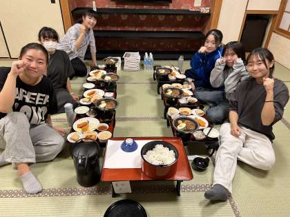 メニューは、ハンバーグ、フライ、ロールキャベツなど、バランスよく盛りだくさんです。お昼ご飯が早かった分、お腹も空いているでしょう。たくさん食べてくださいね。写真は、上から4組B班→5組B・C班です。