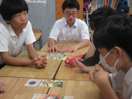 実習『粘土で作る和菓子』に取り組むにあたり、導入としてさまざまな和菓子の写真カードが配られました。それらが、春夏秋冬いつの和菓子であるかを分類しています。見た目や名称にも季節感が表れていますね。