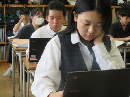 公の場で聞き手に提案や主張をする『パブリックスピーキング』の学習です。本日は、テーマを決めていました。先生が挙げてくださった例を選ぶ人もいれば、ニュースサイトを検索し自分で決める人もいるようです。