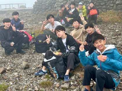 山頂での集合写真撮影を諦めて、下山中です。