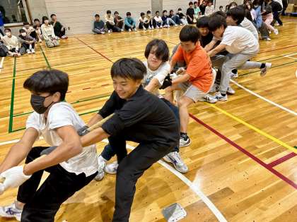 クラス対抗綱引きの他、明日の第二弾に備えた作戦会議や練習に取り組みました。写真は、上から4組→3組→2組の様子です。