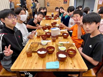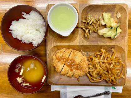 メニューは、ロースとんかつ、焼きうどん、ボイル野菜、ワカサギ唐揚げ、寒天ゼリー、ご飯、味噌汁です。