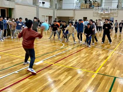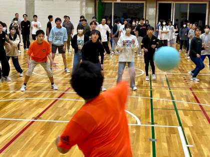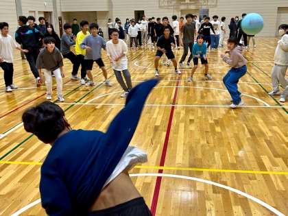 写真は、王様ドッジボールの様子です。通常のドッジボールとの違いは、あらかじめチーム内で1人の「王様」を決定・申告しておき(相手には秘密)、その王様がボールを当てられると残り人数に関係なく勝敗が決する点です。