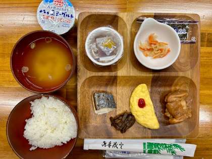 本日のメニューは、オムレツ、さわら塩焼き、チキン照り焼き、きゃらぶき、切り干し大根、味付け海苔、納豆、ヨーグルト、ご飯、味噌汁です。